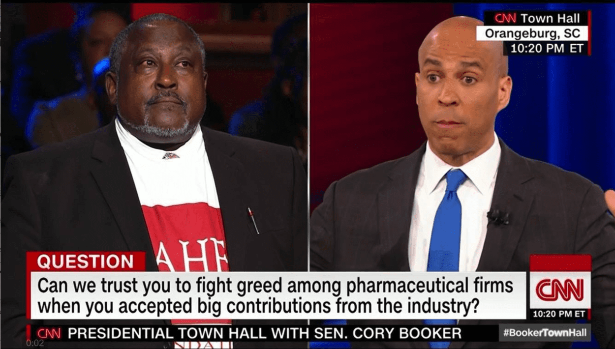The image of our mobilizer, David Alexander, and Senator Cory Booker is an exceptional example of our efforts to hold presidential candidates accountable. Candidates like Cory Booker need to assure the public that their connections to powerful pharmaceutical lobbyists will not sway their political agendas. We need candidates who will commit to fighting for those in need without letting campaign contributions and backroom deals cloud their judgment.